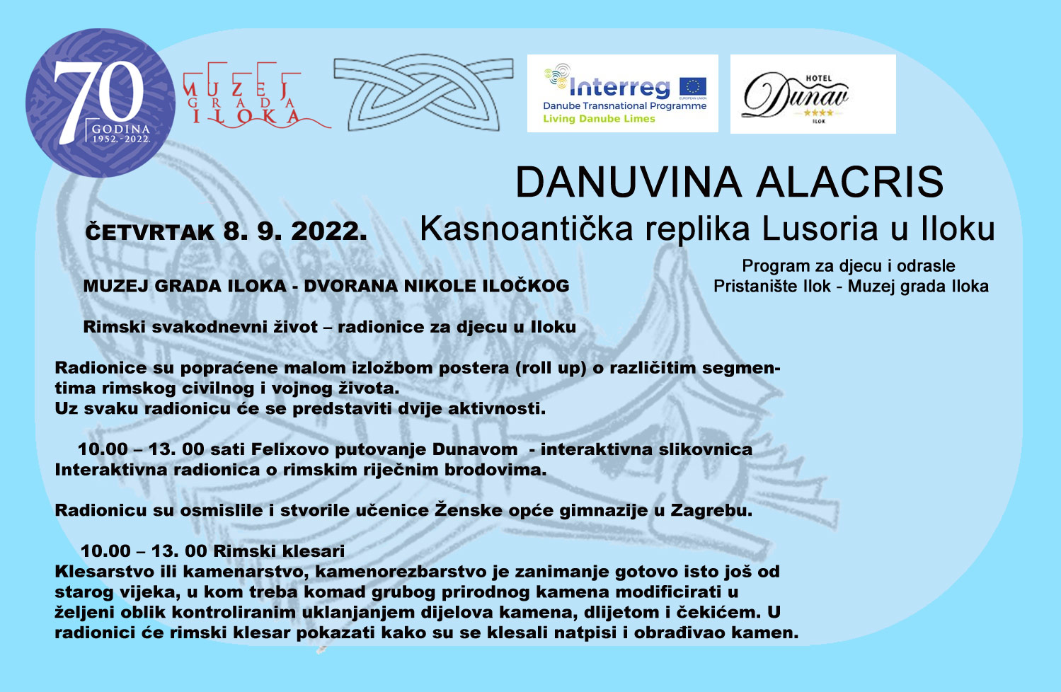 Program Living Danube Limes započinje u četvrtak 8. 9. u Muzeju grada Iloka kao suorganizatora u dvorani Nikole Iločkog, demonstracijom Rimskog klesarstva i interaktivnom slikovnicom Felixovo putovanje Dunavom. Radionicu su osmislile i stvorile učenice нenske opće gimnazije u Zagrebu.